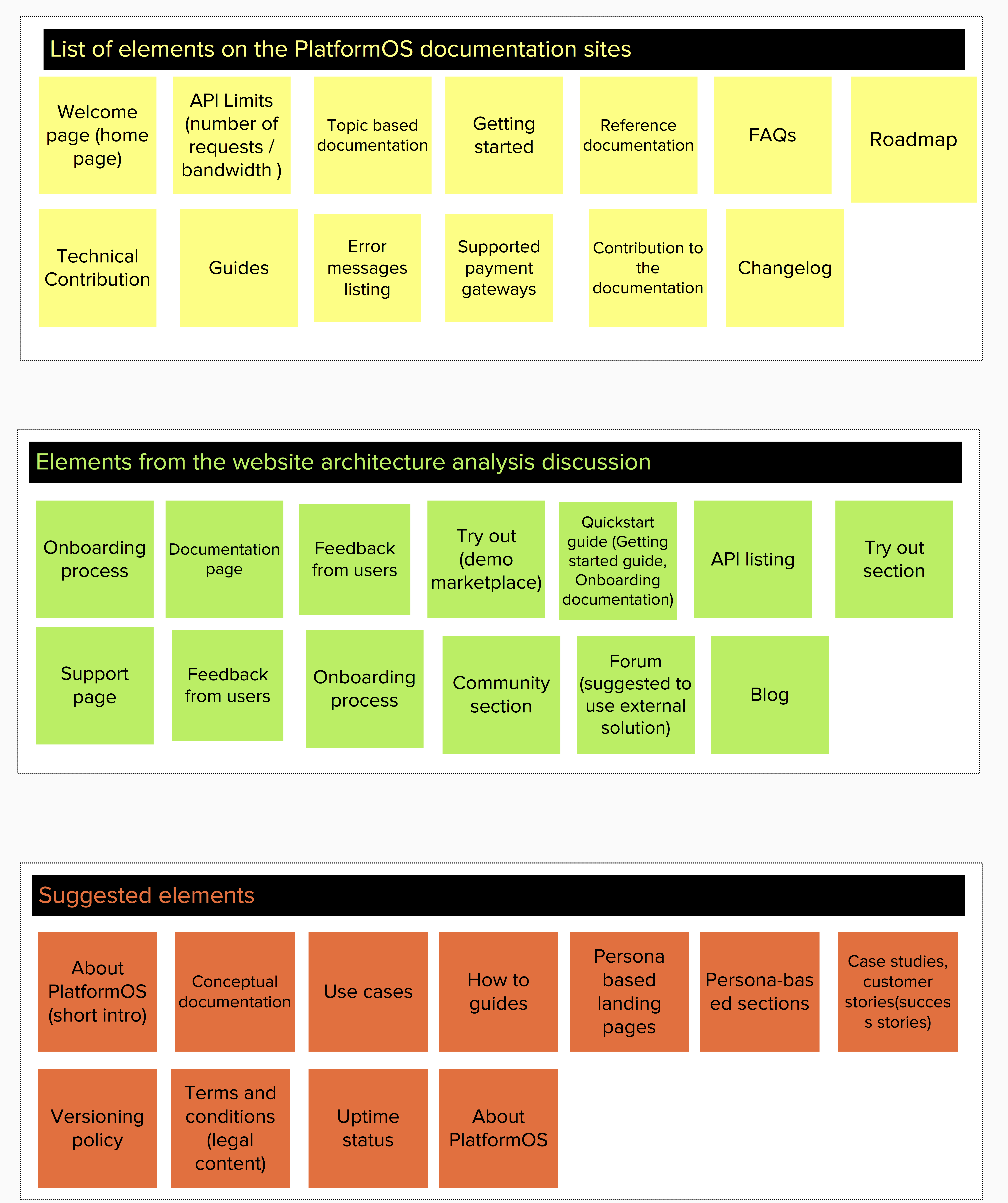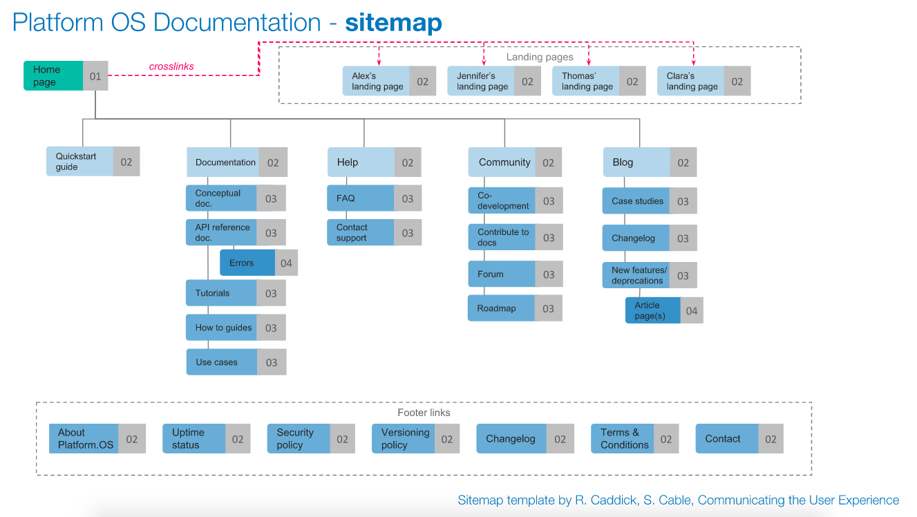 We have already changed some parts of our sitemap based on new information we gathered and business decisions we made. For example, we are now planning to build a separate community site, instead of having a community section on our documentation site. We decided to link to content on platformos.com (like the blog, terms & conditions, etc.) in the beginning to focus on other parts of the site, and reevaluate these sections later. We believe that both product and content development can benefit from a process that allows for such flexibility.